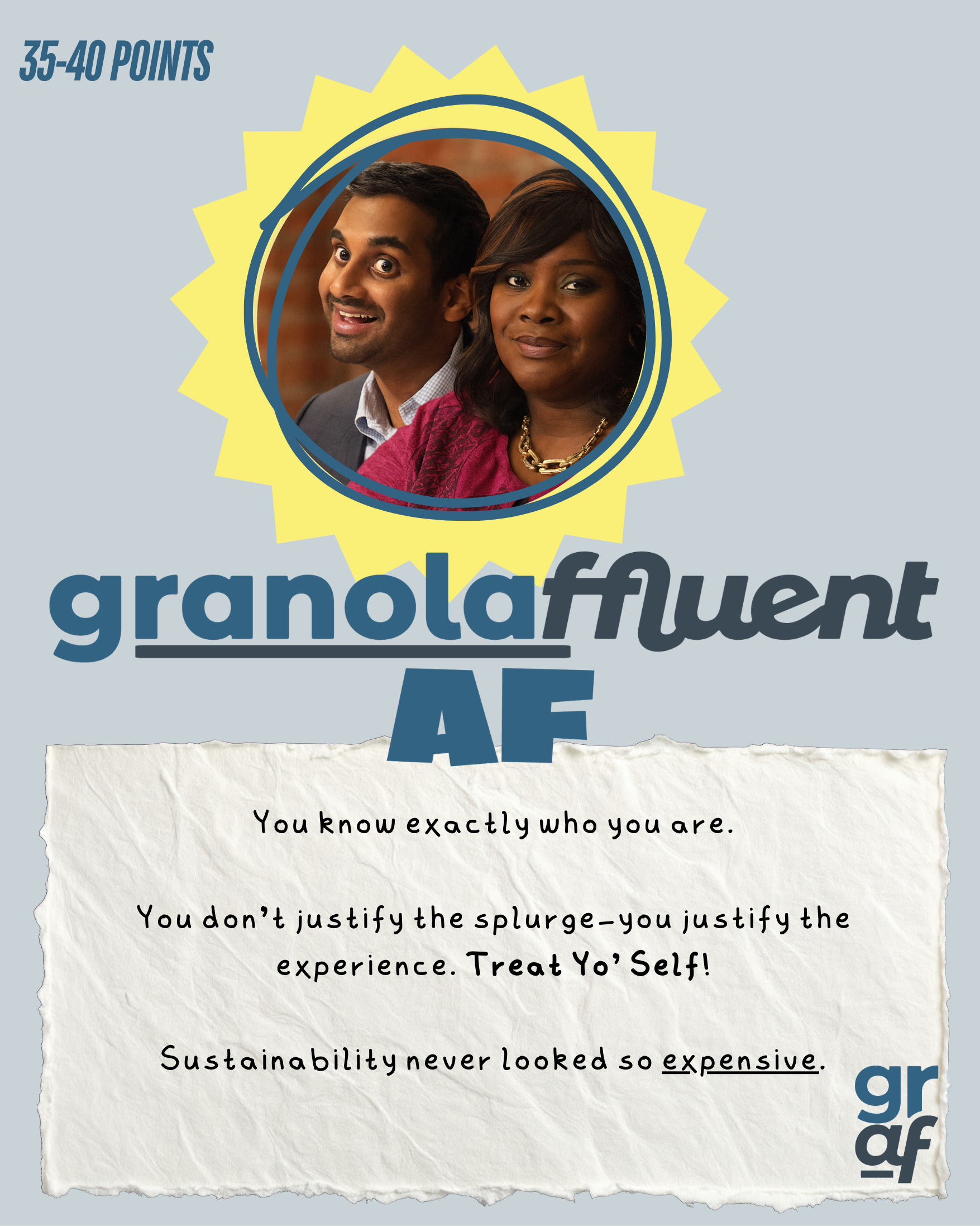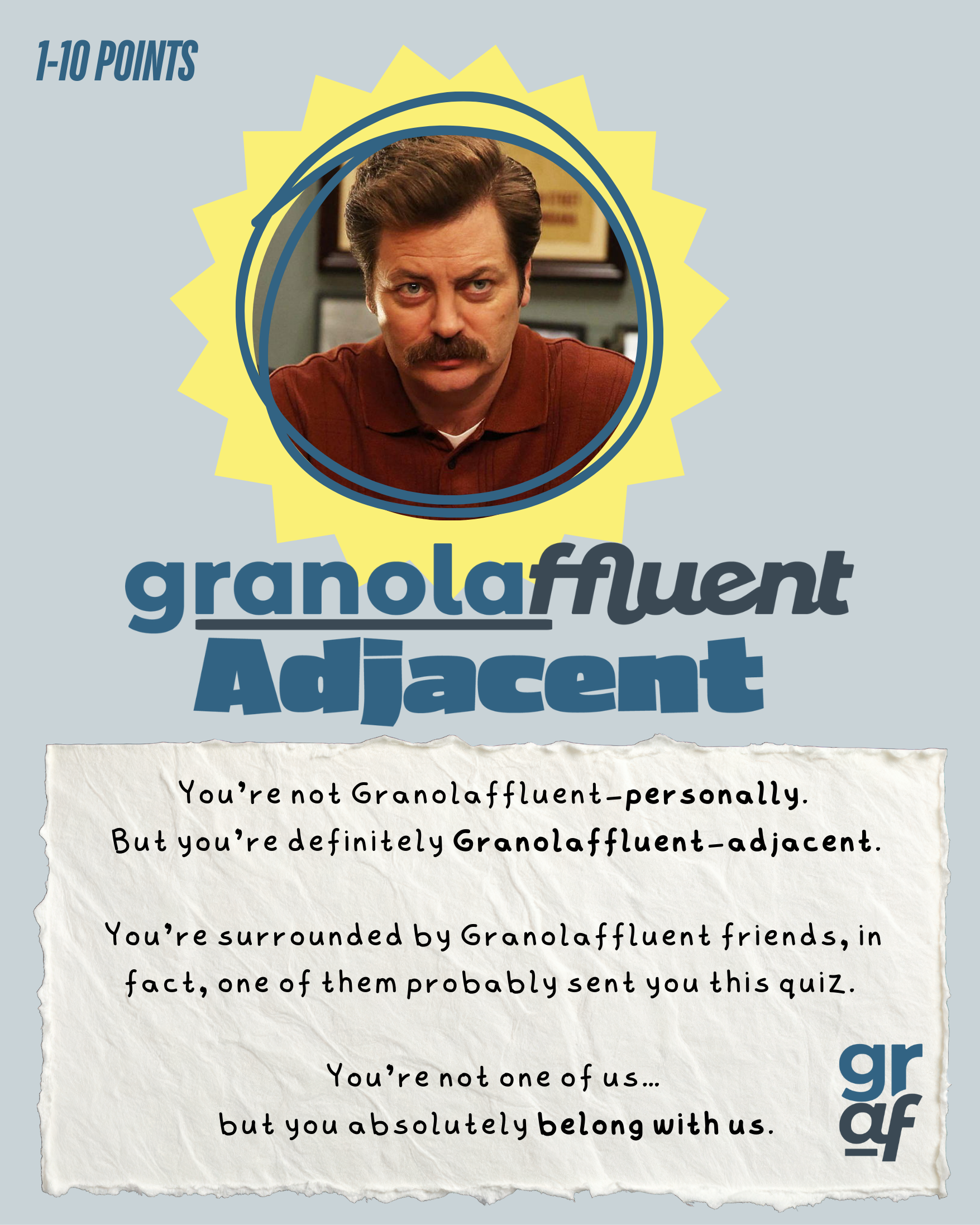 You’re surrounded by Granolaffluent friends, in fact, one of them probably sent you this quiz. You’re not one of us… but you absolutely belong with us.